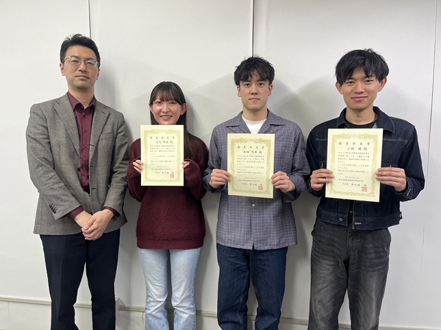- 神経行動薬理若手研究者の集いにて修士課程1年 久代実采さん、修士1年 和田悠吾さん、学部4年 小林建さんが優秀発表賞を受賞しました。(写真)